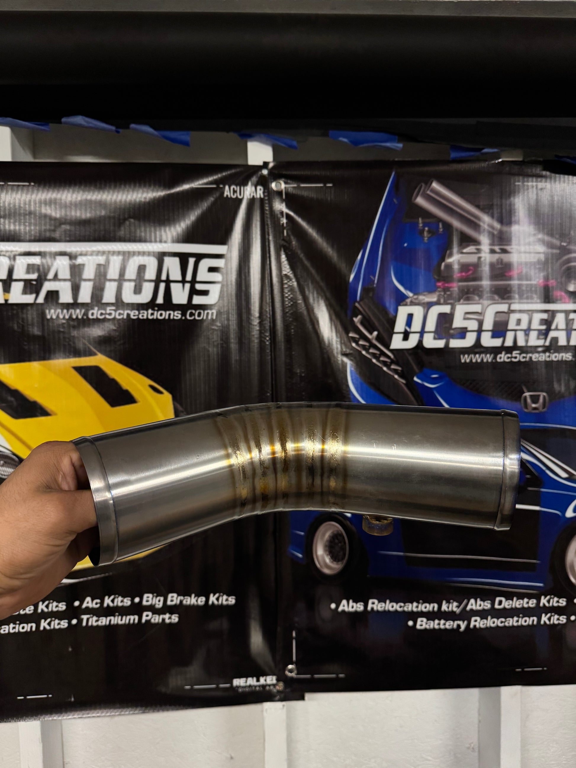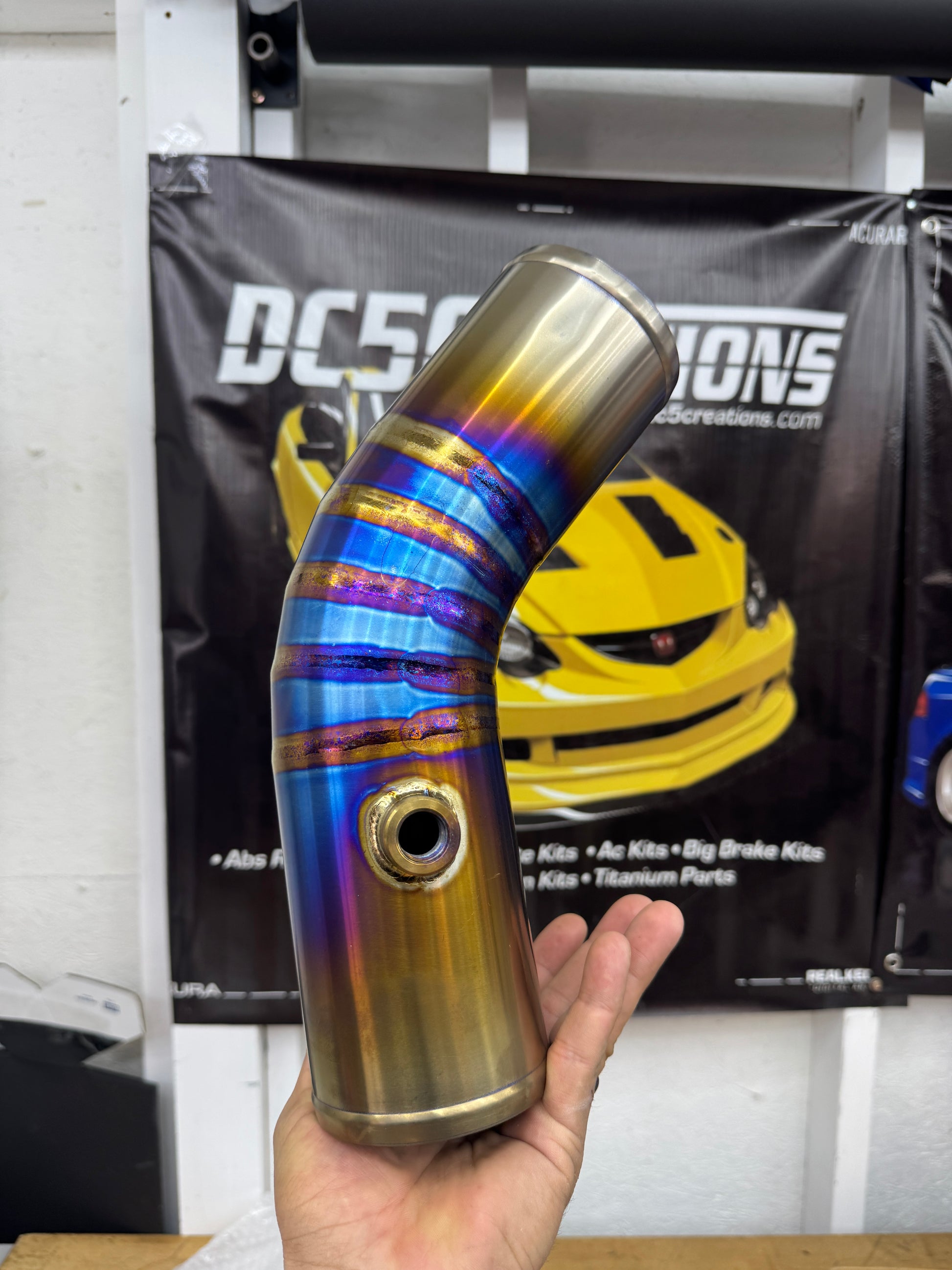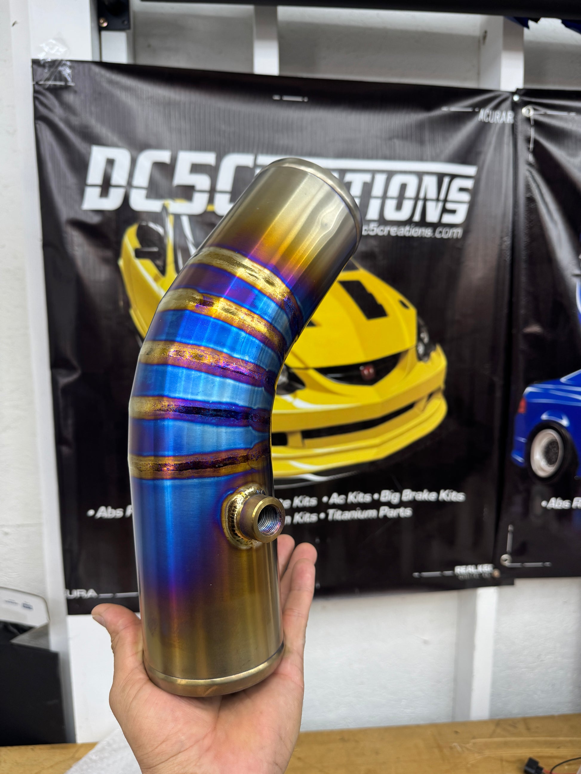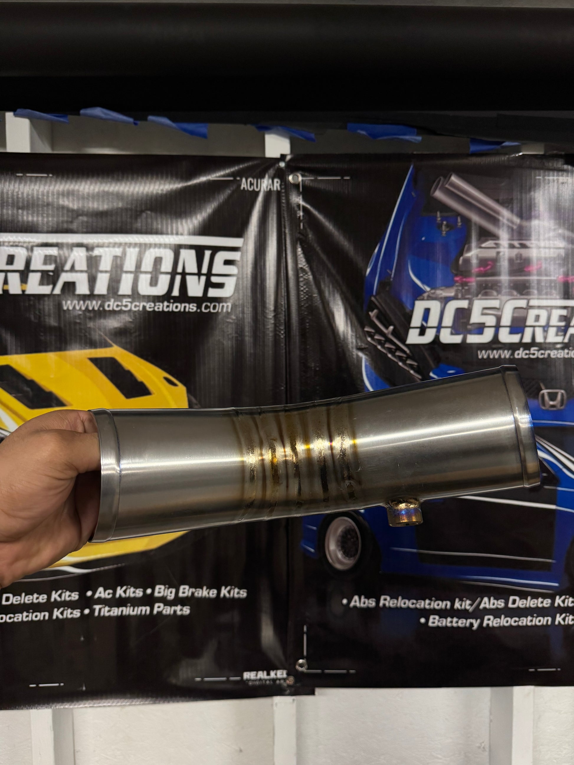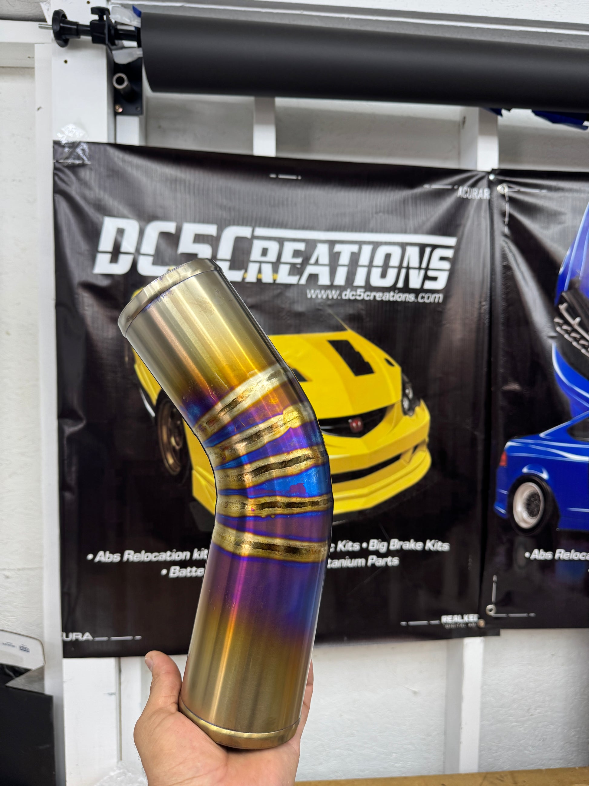 Dc5creations original product. Our 3.5-inch Titanium intake was a total of 5 pie cut welds. 3/8 titanium bung is welded toward the end by the air filter for the temp sensor. Does not come with a coupler, clamps & filter. Does included temp sensor adapter bung.