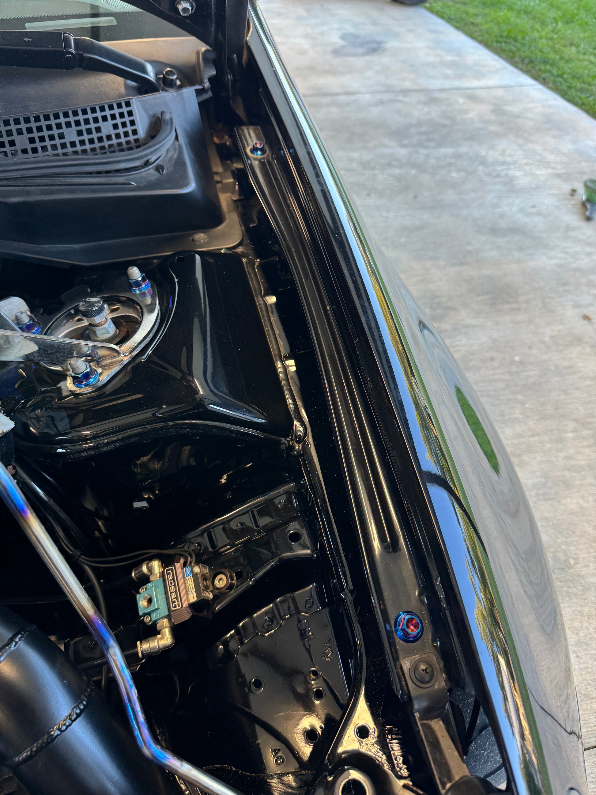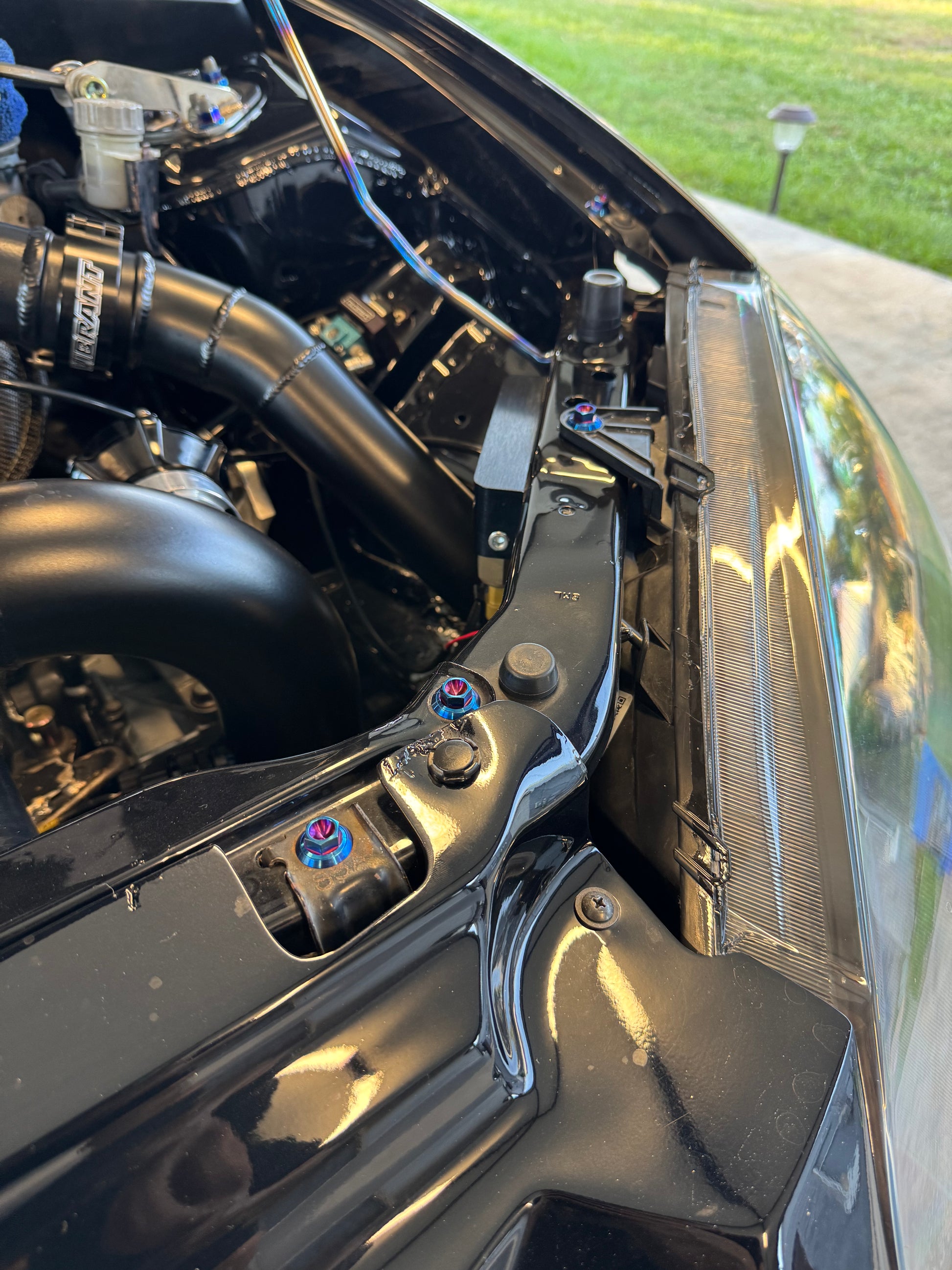 Our ultralight, hollow-domed M6 x 1.0 bolts and beauty washers replace the 10mm-headed hardware holding the headlight brackets and hood hinges.