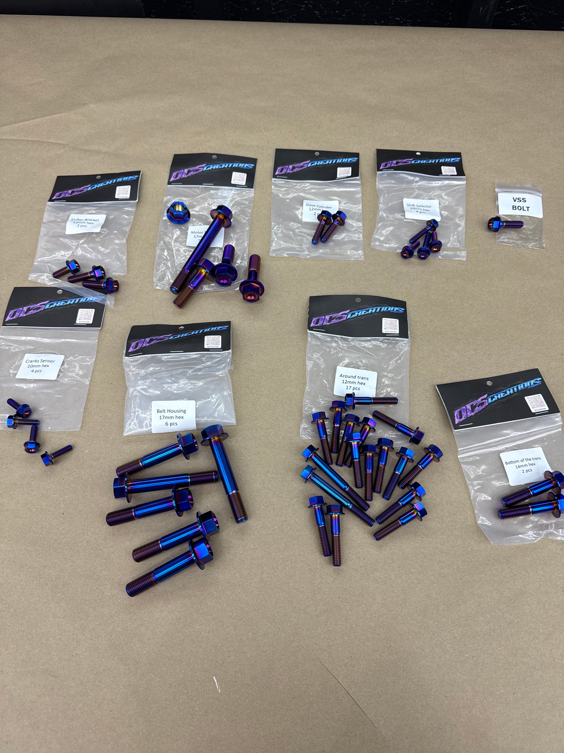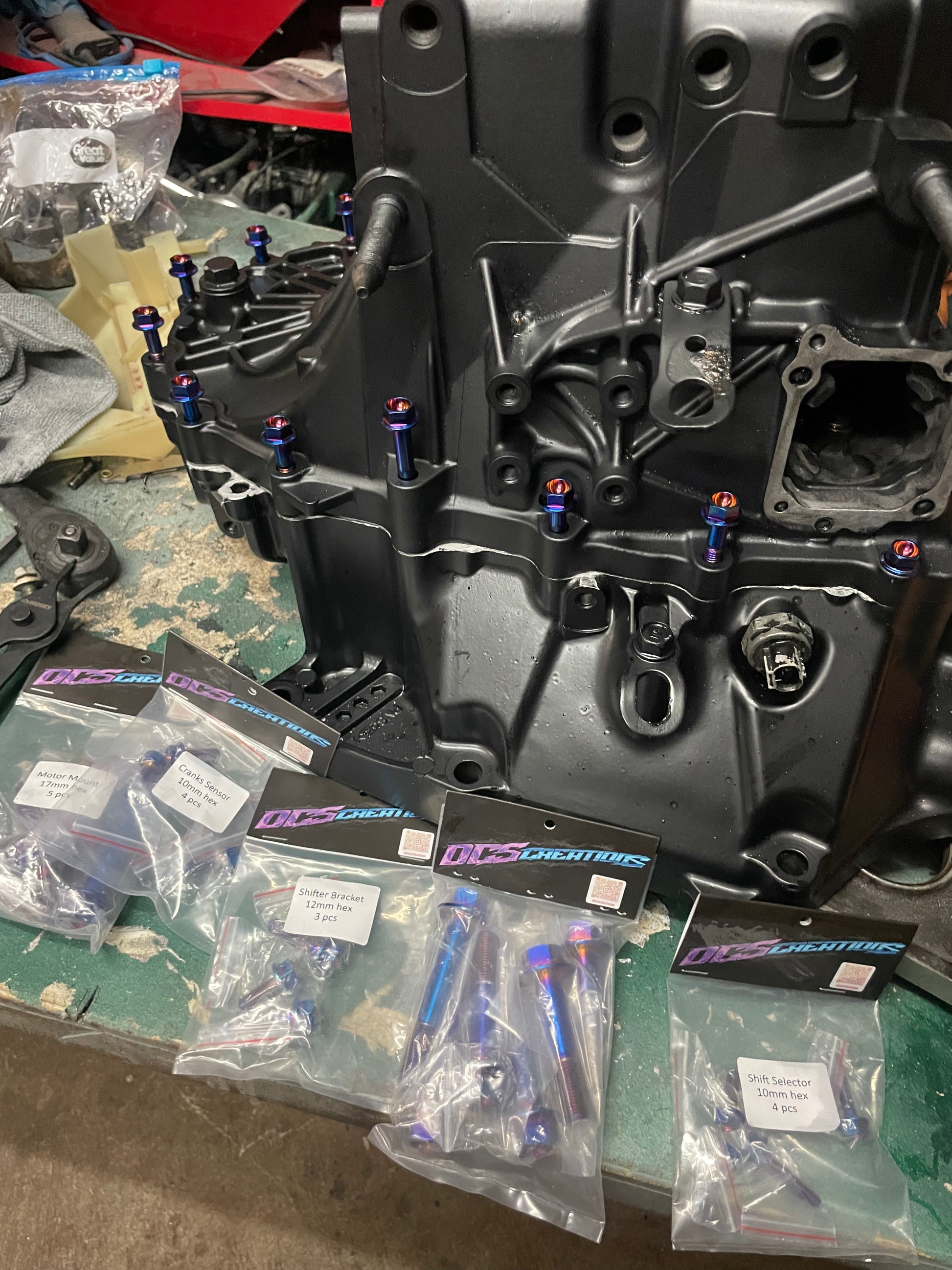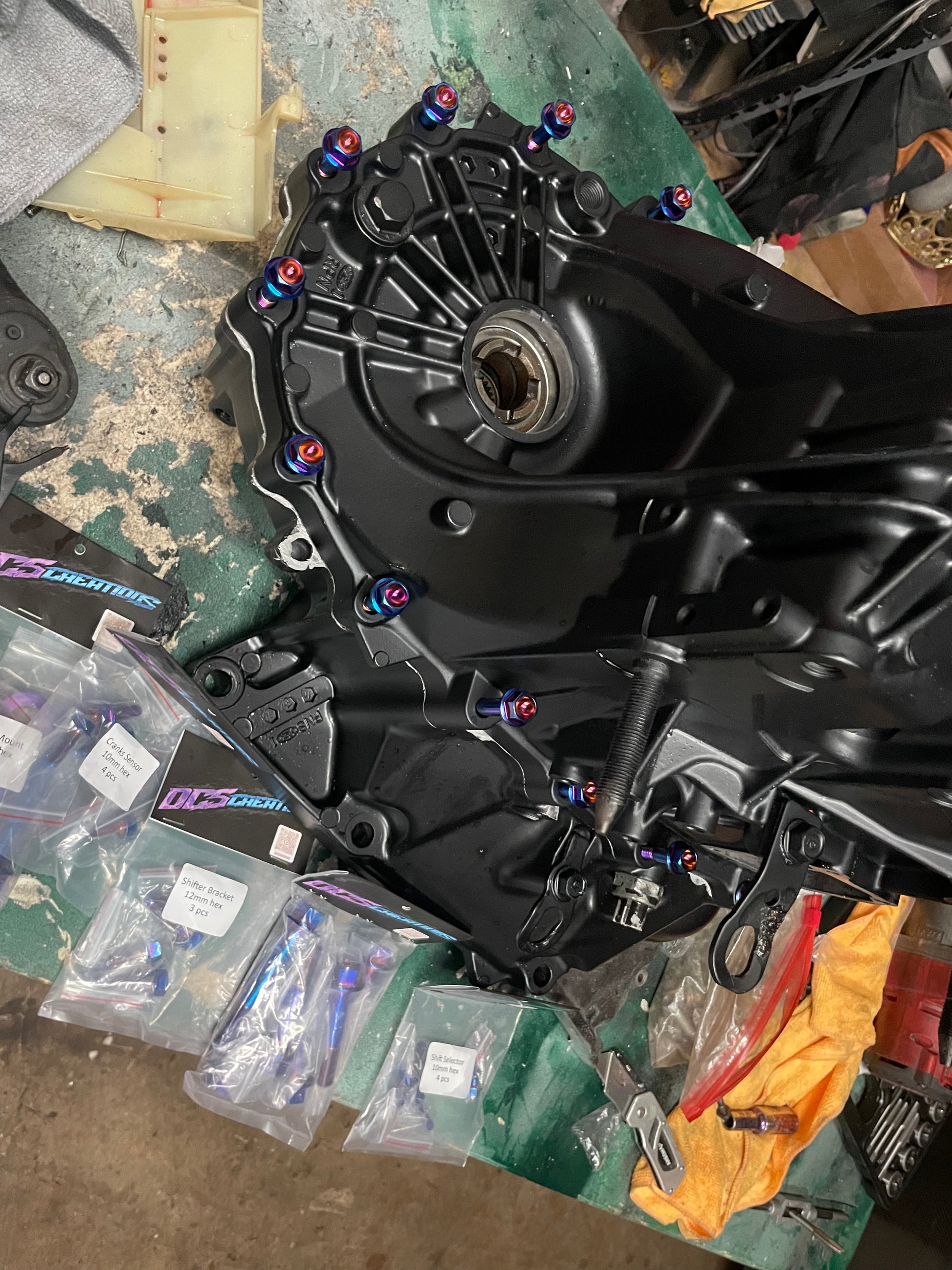 The Dc5creations titanium hardware includes a variety of essential components, such as bolts, nuts, and sensors. Design for Rsx trans w/ aluminum oil pan.